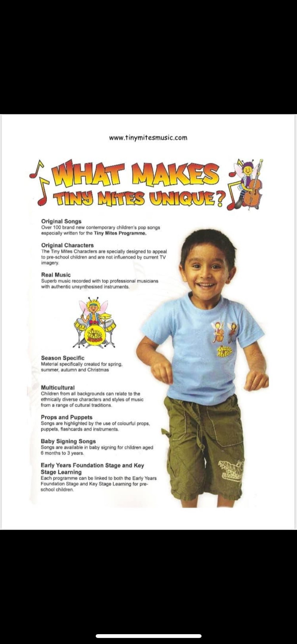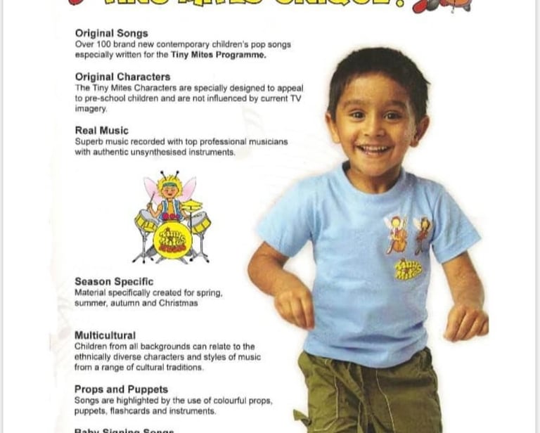 Tiny Mites Music is an interactive music/drama/dance programme for pre-school children and babies. Our professional actors/singers currently present classes in daycare nurseries and schools in Herts, Beds, Bucks, London and Essex.